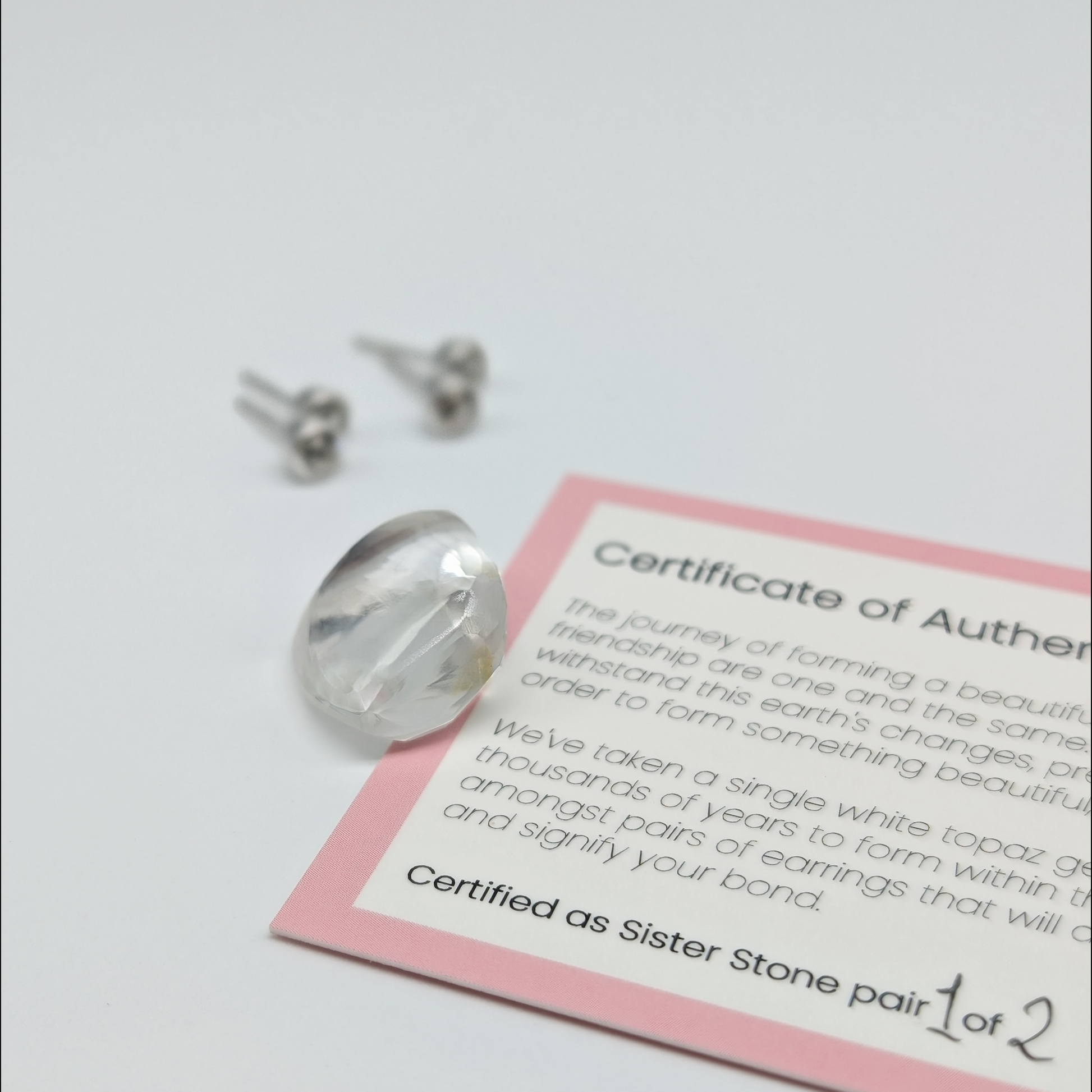 We've taken a single white topaz gemstone, the stone of friendship and honesty, and divided it amongst two pairs of Sister Stones earrings that will always share a connection, and signify your bond.