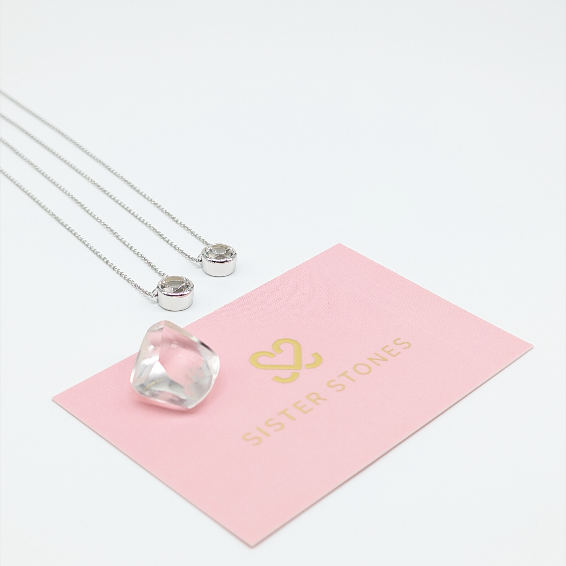 We've taken a single white topaz gemstone, the stone of friendship and honesty, and divided it amongst two Sister Stones necklaces that will always share a connection, and signify your bond.