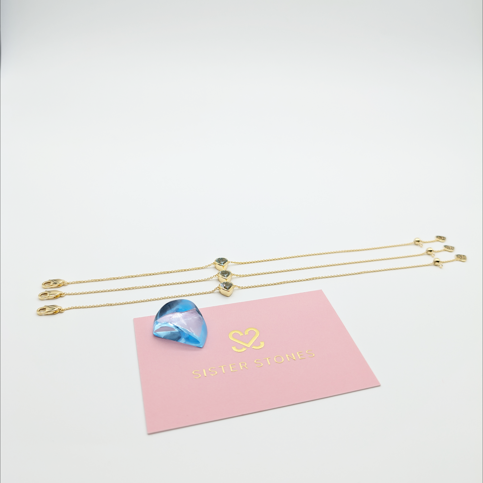 We've taken a single blue topaz gemstone, the stone of harmony and loyalty, and divided it amongst three Sister Stones bracelets that will always share a connection, and signify your bond.