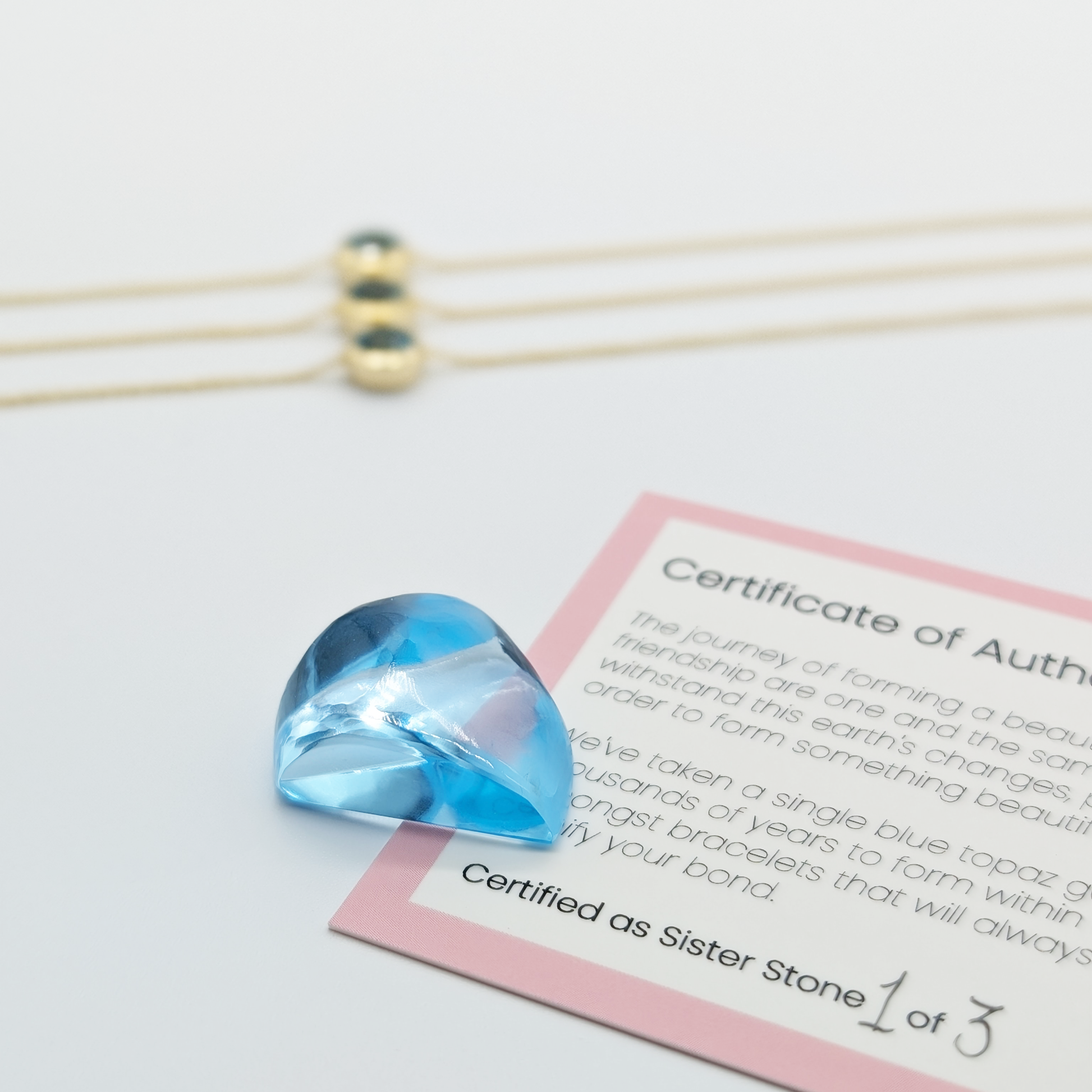 We've taken a single blue topaz gemstone, the stone of harmony and loyalty, and divided it amongst three Sister Stones bracelets that will always share a connection, and signify your bond.