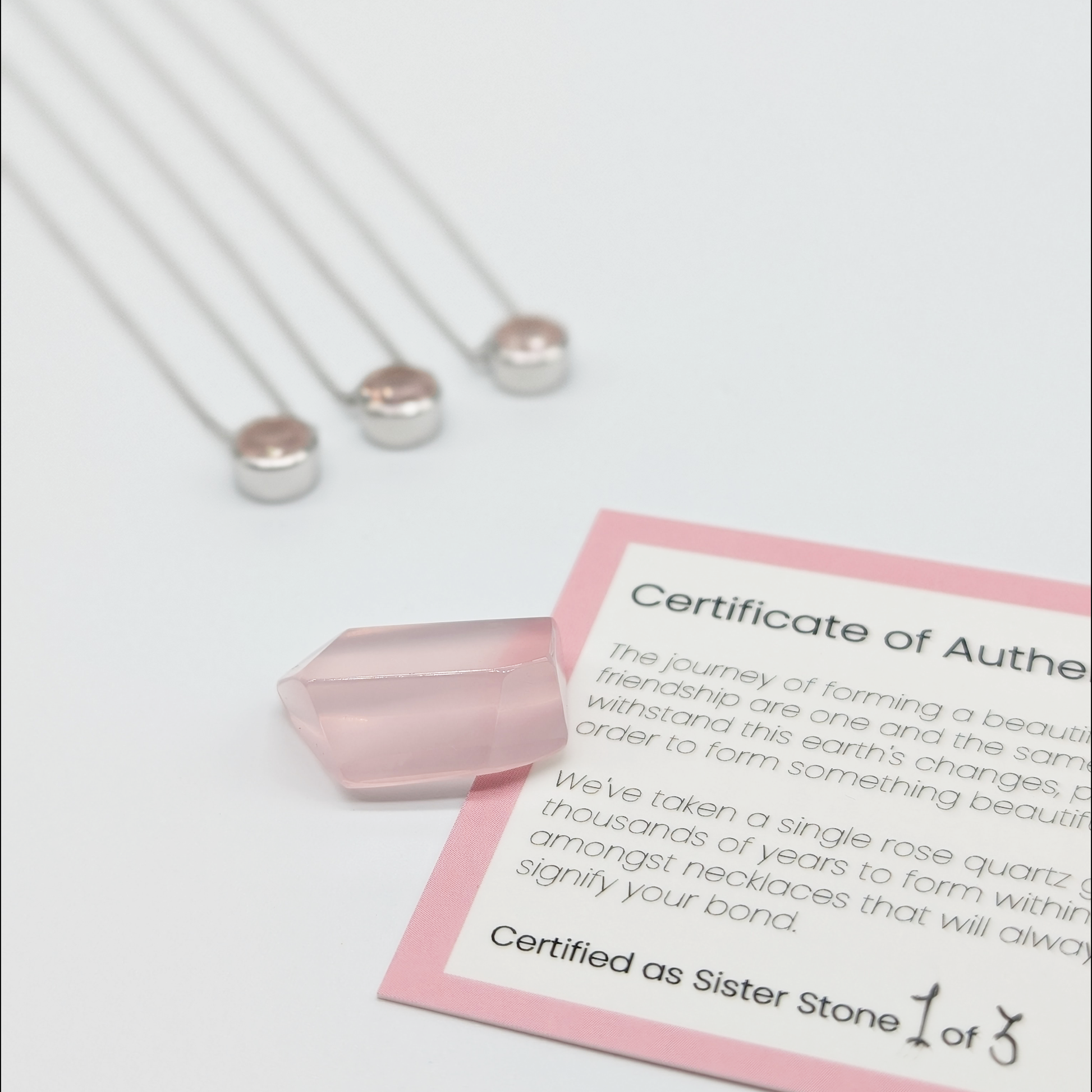 We've taken a single rose quartz gemstone, the stone of love and compassion, and divided it amongst three Sister Stones necklaces that will always share a connection, and signify your bond.