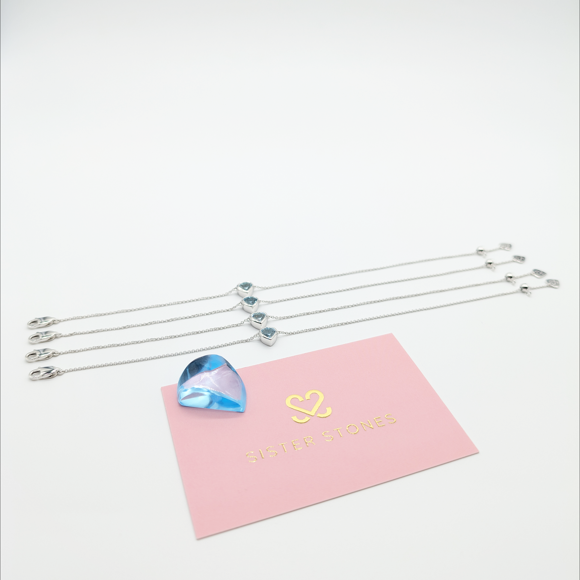 We've taken a single blue topaz gemstone, the stone of harmony and loyalty, and divided it amongst four Sister Stones bracelets that will always share a connection, and signify your bond.