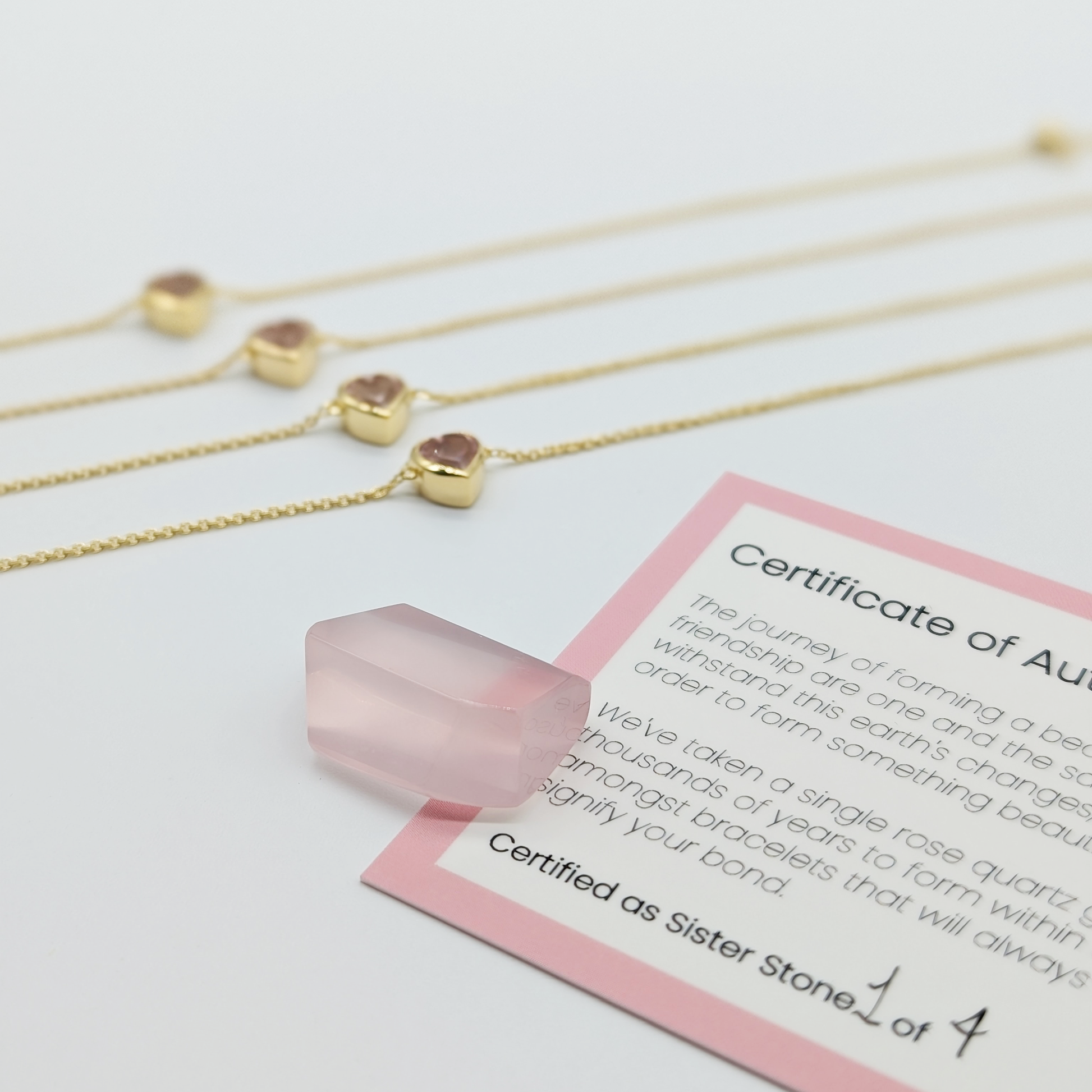 We've taken a single rose quartz gemstone, the stone of love and compassion, and divided it amongst four Sister Stones bracelets that will always share a connection, and signify your bond.