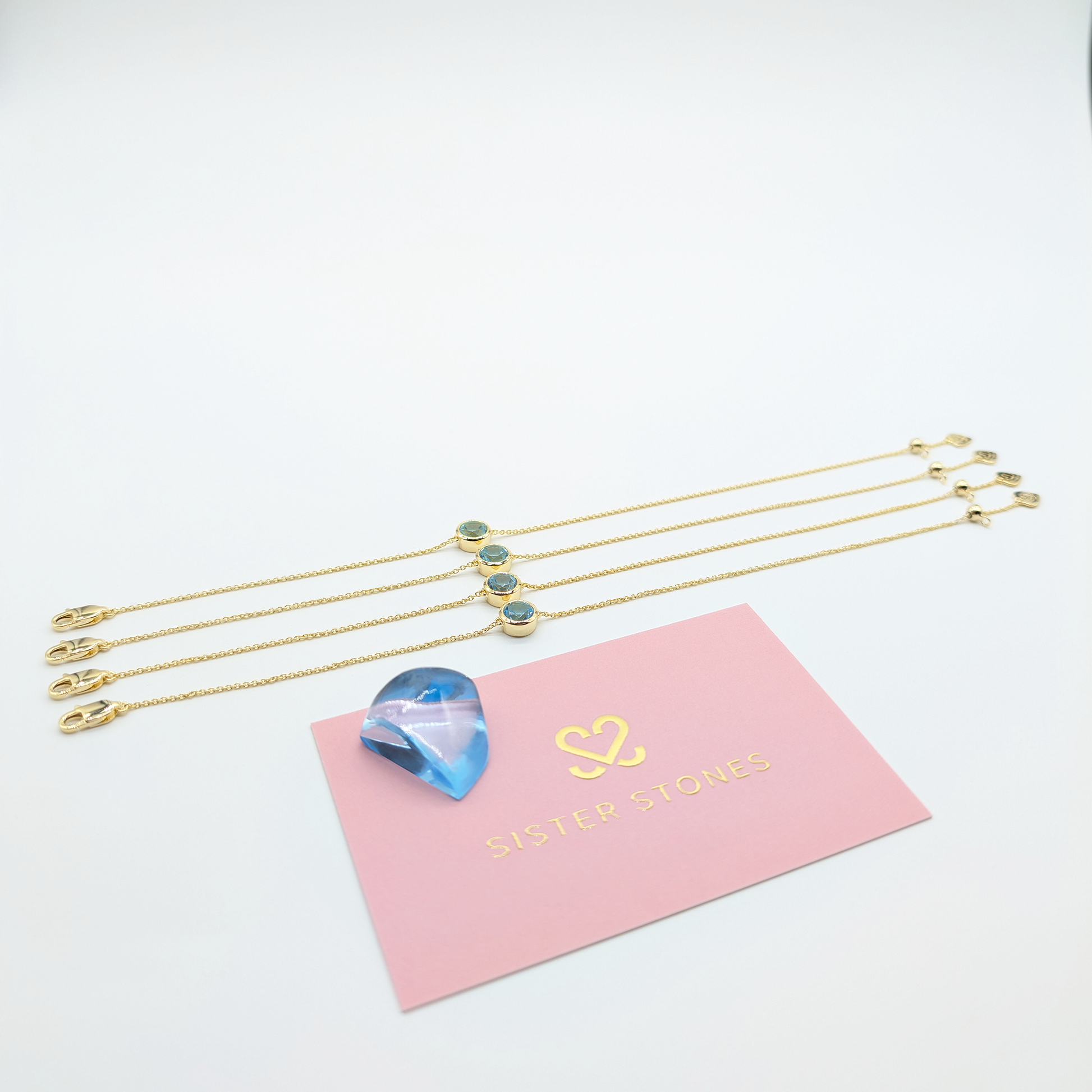 We've taken a single blue topaz gemstone, the stone of harmony and loyalty, and divided it amongst four Sister Stones bracelets that will always share a connection, and signify your bond.