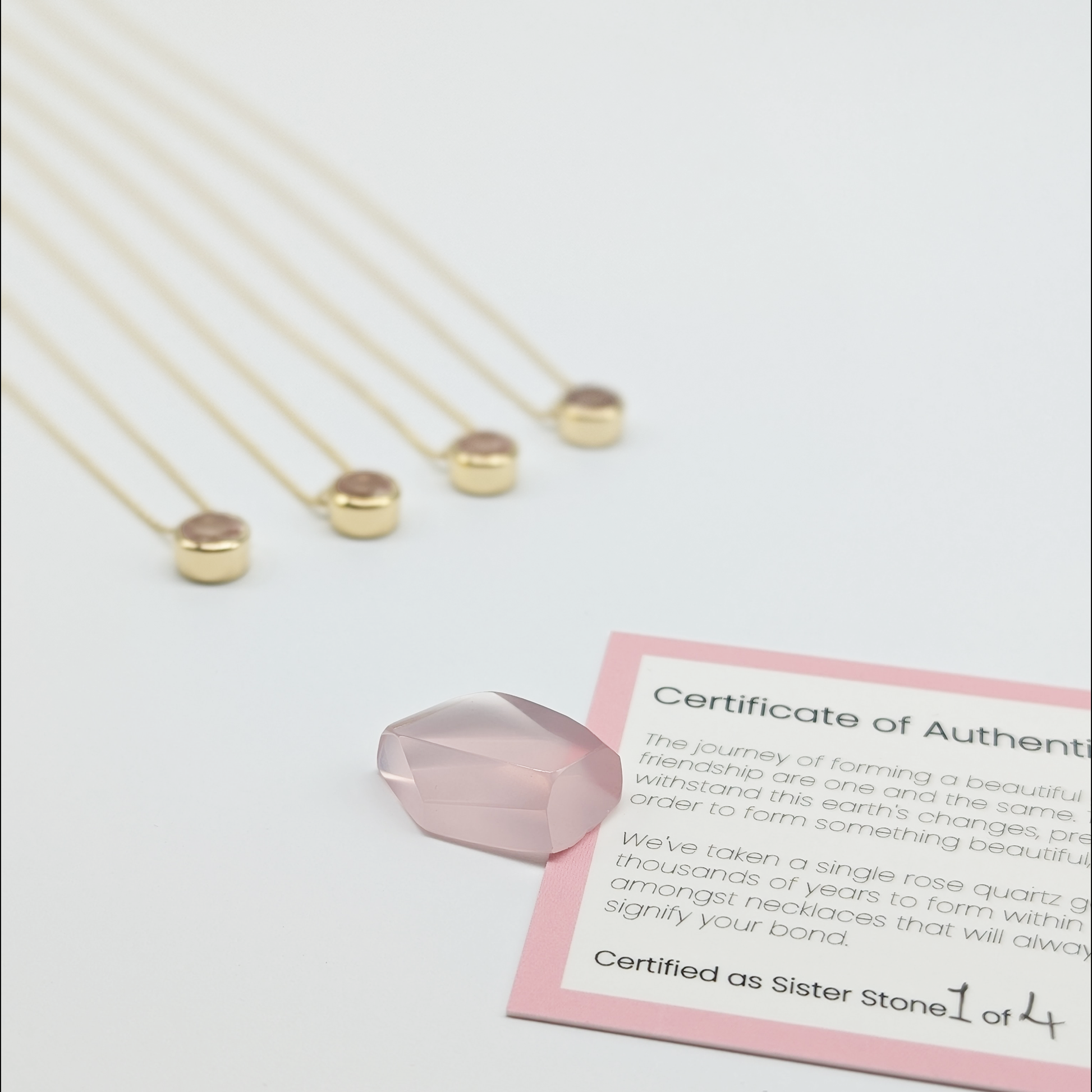 We've taken a single rose quartz gemstone, the stone of love and compassion, and divided it amongst four Sister Stones necklaces that will always share a connection, and signify your bond.
