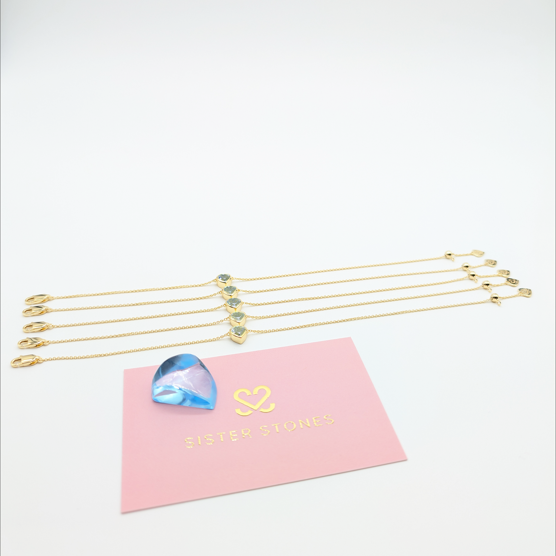 We've taken a single blue topaz gemstone, the stone of harmony and loyalty, and divided it amongst five Sister Stones bracelets that will always share a connection, and signify your bond.