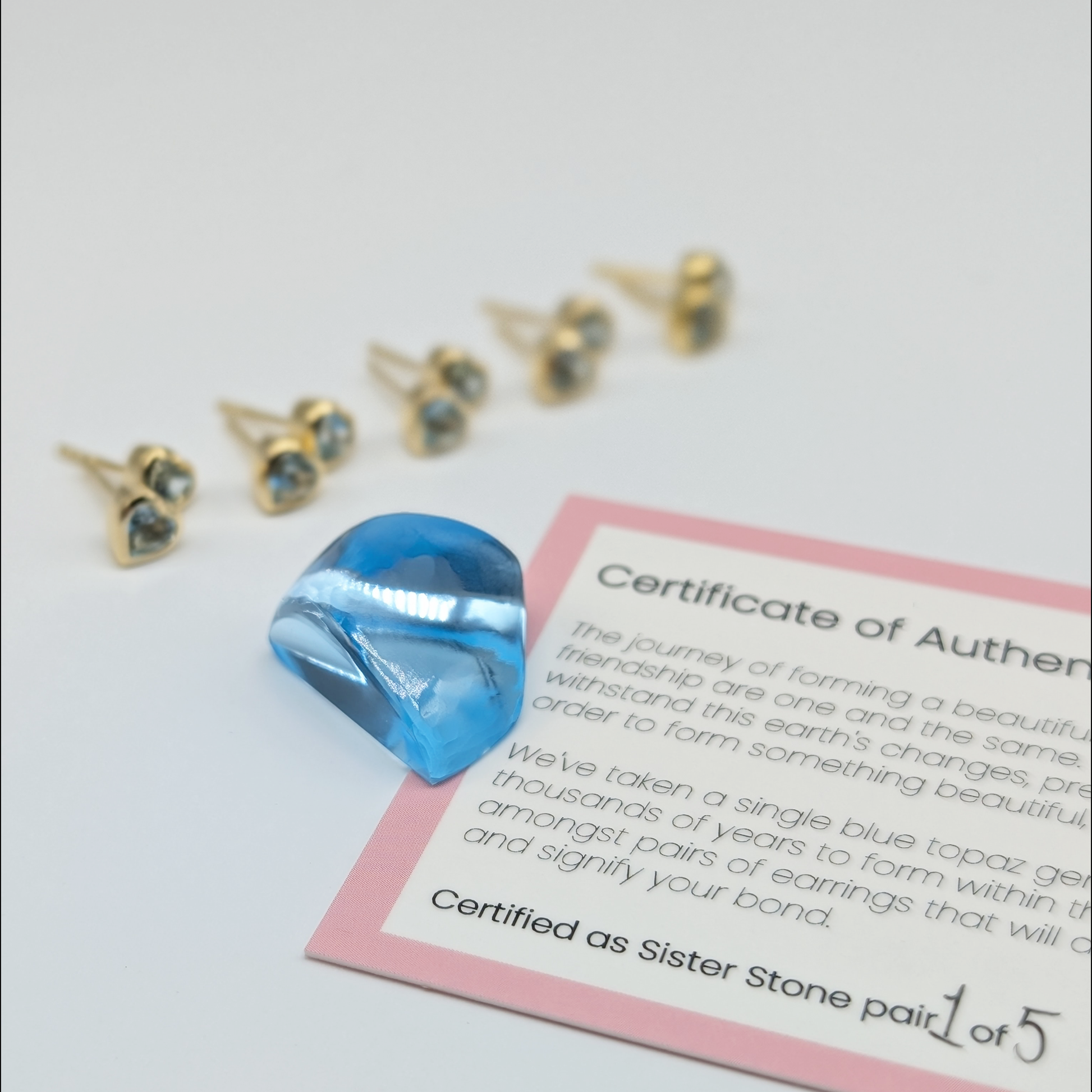 We've taken a single blue topaz gemstone, the stone of harmony and loyalty, and divided it amongst five pairs of Sister Stones earrings that will always share a connection, and signify your bond.