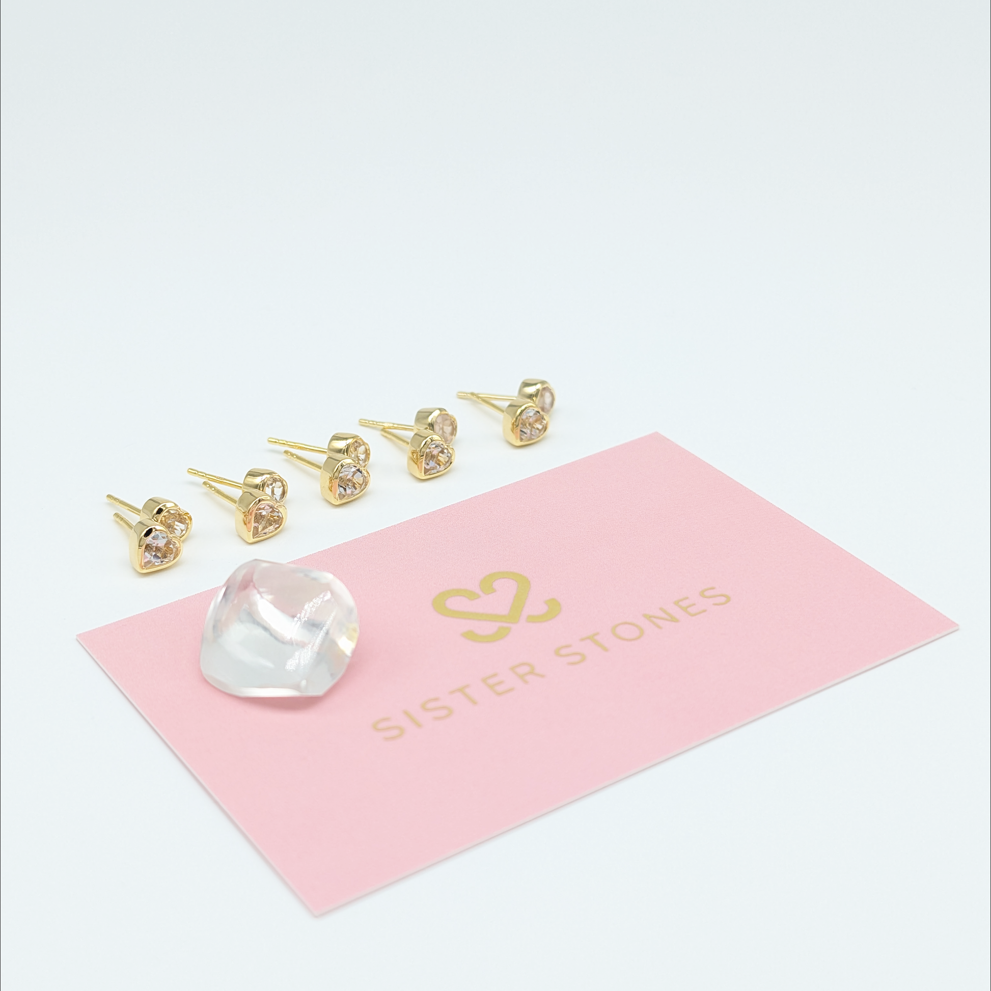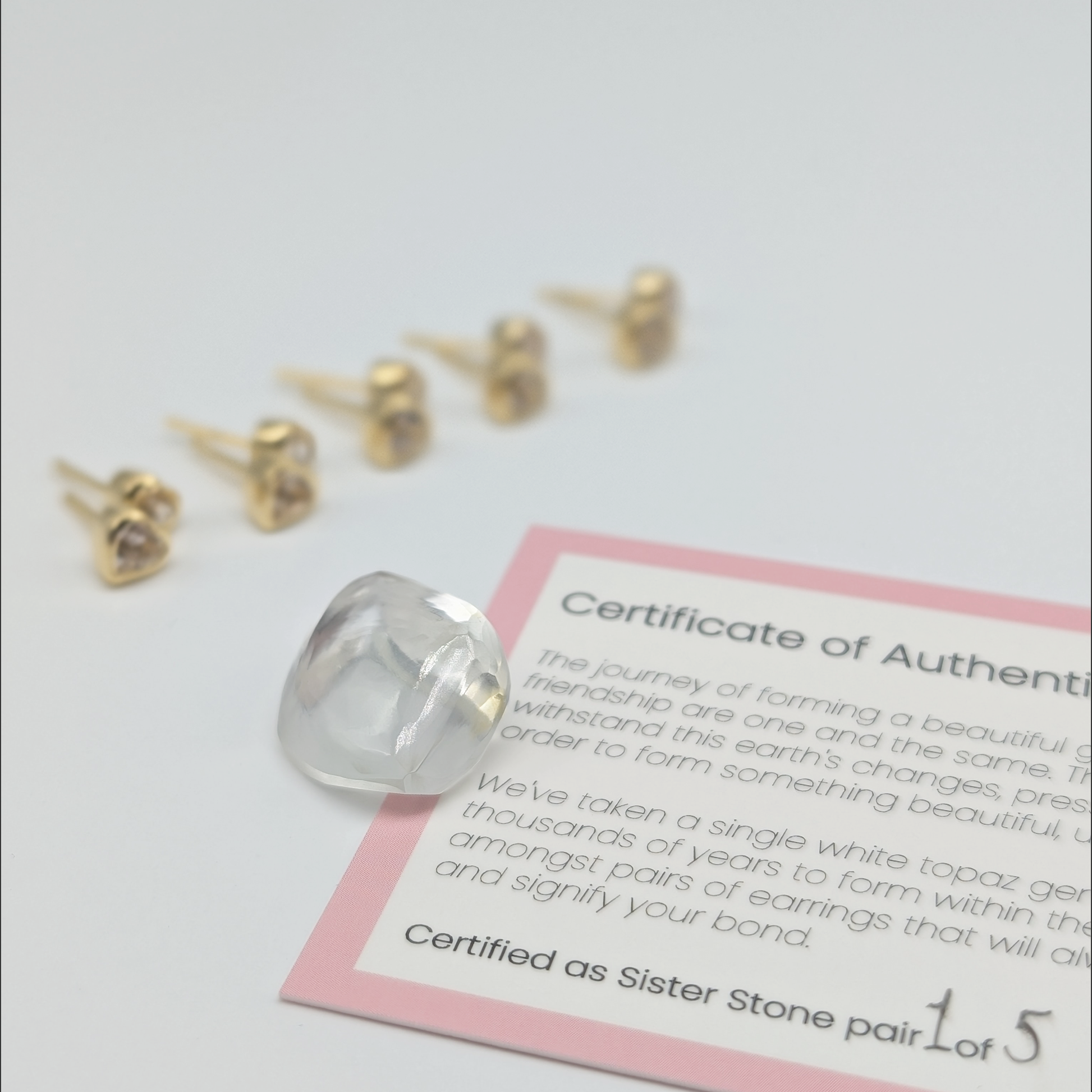 We've taken a single white topaz gemstone, the stone of friendship and honesty, and divided it amongst five pairs of Sister Stones earrings that will always share a connection, and signify your bond.