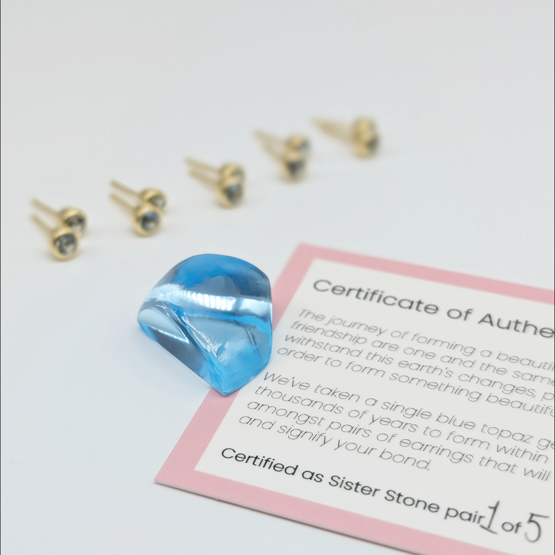 We've taken a single blue topaz gemstone, the stone of harmony and loyalty, and divided it amongst five pairs of Sister Stones earrings that will always share a connection, and signify your bond.