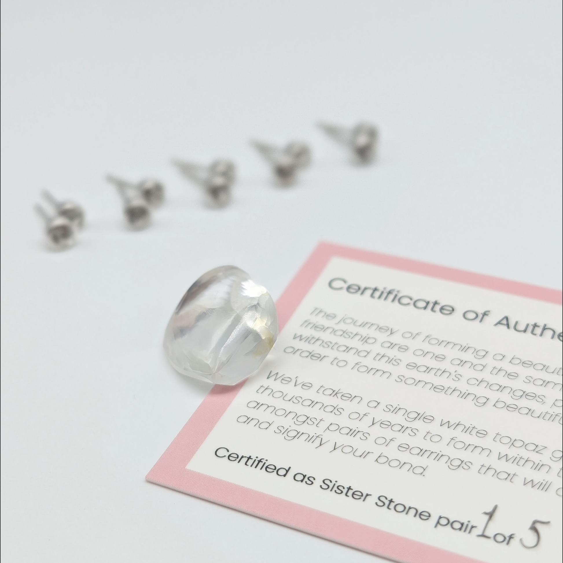 We've taken a single white topaz gemstone, the stone of friendship and honesty, and divided it amongst five pairs of Sister Stones earrings that will always share a connection, and signify your bond.