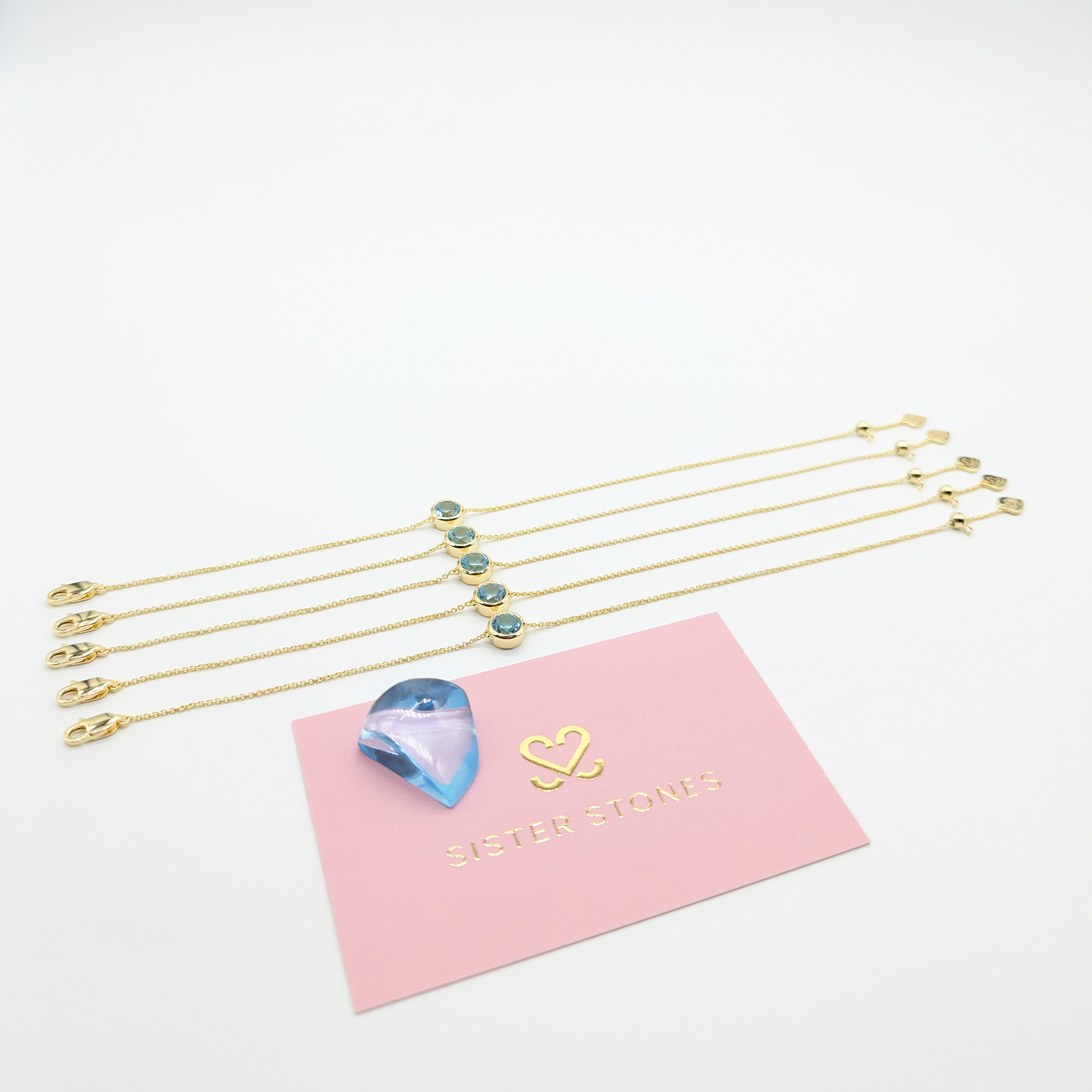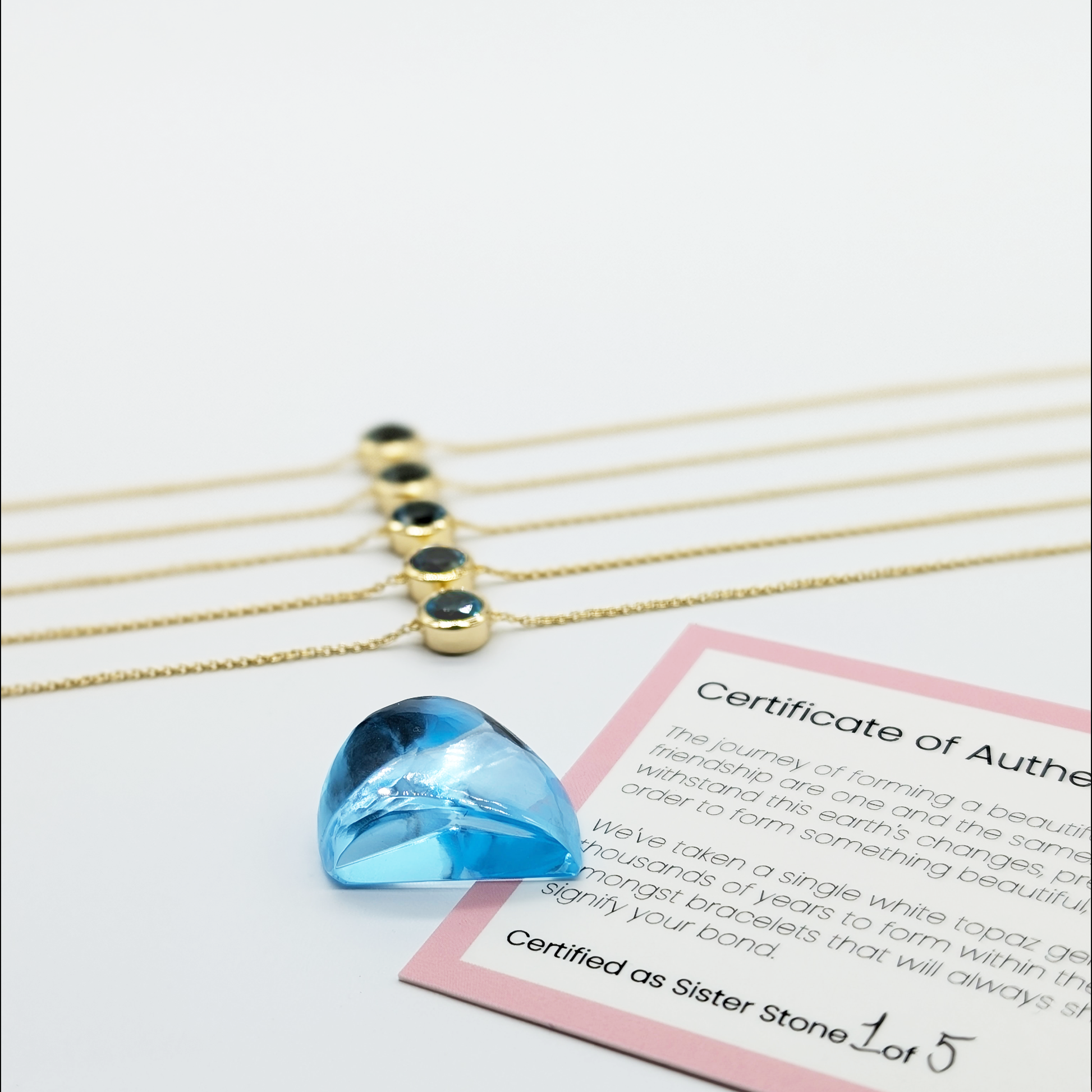 We've taken a single blue topaz gemstone, the stone of harmony and loyalty, and divided it amongst five Sister Stones bracelets that will always share a connection, and signify your bond.