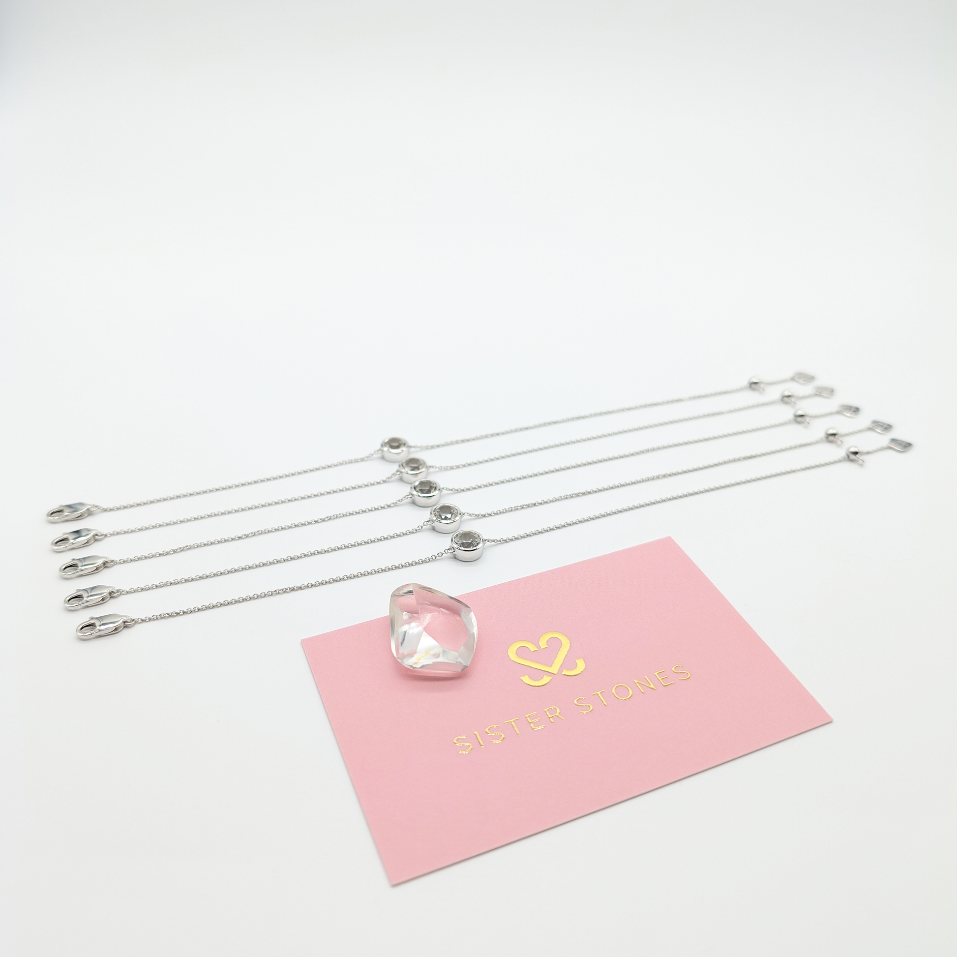 We've taken a single white topaz gemstone, the stone of friendship and honesty, and divided it amongst five Sister Stones bracelets that will always share a connection, and signify your bond.